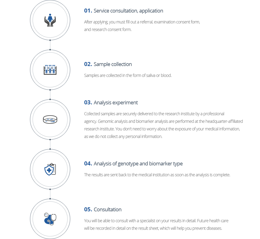 by extracting DNA from cells isolated from blood, saliva or tissue. - Heredity is a valuable legacy that passes on characteristics from parents to their children, and genes are the unit of genetic information. Genomic testing is a test that analyzes genes associated with a specific disease by extracting DNA from cells. Human genes are 99.9% identical and only 0.1% different; this small difference, however, determines individual-specific differences in appearance, personality, susceptibility to disease (disease incidence) and drug absorption and response. Therefore, precision healthcare allows the prediction of an individual's genetic disease incidence by detecting many types of disease-causing genetic variants and analyzing their effects through genomic testing. The purpose of genomic testing is to produce "customized medical information" that predicts the risk of disease, and guides the patient in improving or changing his or her lifestyle in order to prevent such disease.